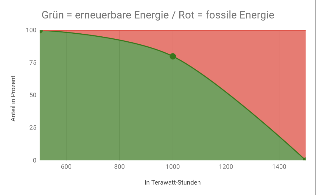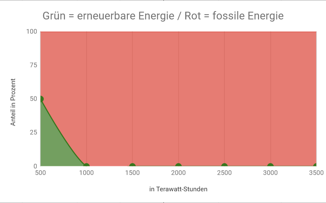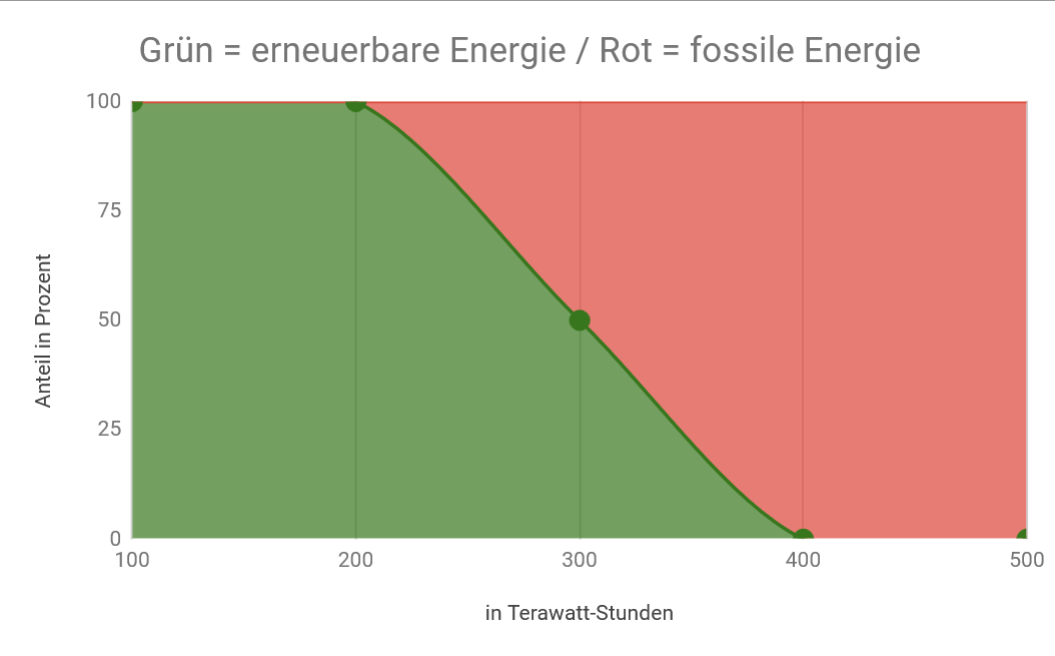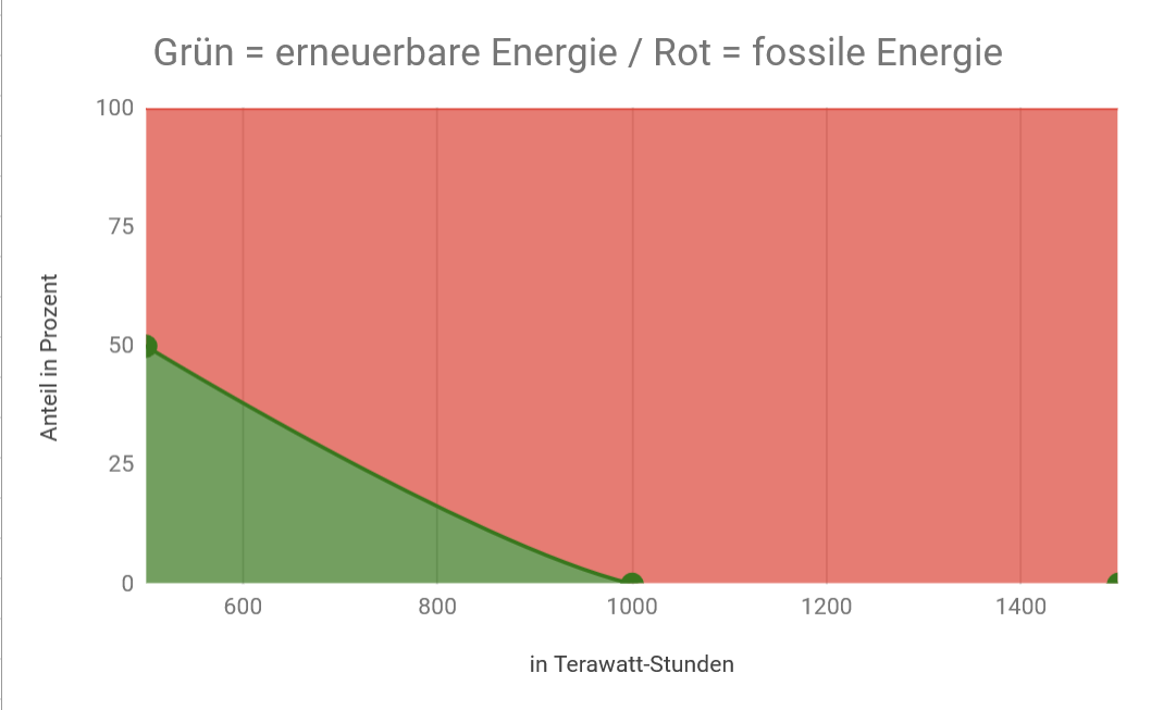1. Grafik: 250 Twh erneuerbare Energie + 250 Twh fossile Energie = 500 Twh produzierter Strom