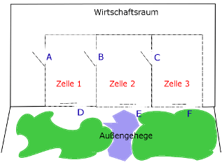 Nachdem die Pflegerin in die Zelle 1 gegangen ist, hat sie dabei hochwahrscheinlich auch noch vergessen, die Tür A wieder zu verschließen, sodass Altai auch in den Bereich des Wirtschaftsraumes gelangen konnte, der eigentlich nur für Menschen vorgesehen ist.